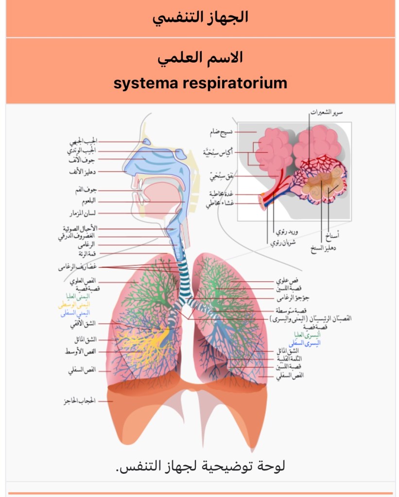 الجهاز التنفسي أو جهاز التنفس يزود خلايا جسم الإنسانبالأكسجين الضروري لأنشطتها، ويخلصها من ثاني أكسيد الكربون (نتاج عملية الأكسدة فيها يمر هواء الشهيق عبر الرغامى والقصبتين (شعبتيه الأضيق اللَّتَين تتفرعان منه قبل الدخول للرئتين) إلى الرئتين. وتشمل كل رئةٍ كثيراً من القصيبات، والتي تتفرع إلى شُعيبات تنتهي بعددٍ كبير من الحويصلات الهوائية (أو الأسناخ) المبطنة بأغشيةٍ رقيقةٍ جداً يجري عبرها تبادل الغازات بينها وبين الشعيرات الدموية التي تحيط بالأسناخ. وتعمل العضلات الوربية (بين الضلوع) والحجاب الحاجز (تحت الرئتين) على تشغيل الرئتين كالكير (منفاخ الحداد)، تسحب الهواء إليهما ثم تدفعه خارجهما في فتراتٍ منتظمة.